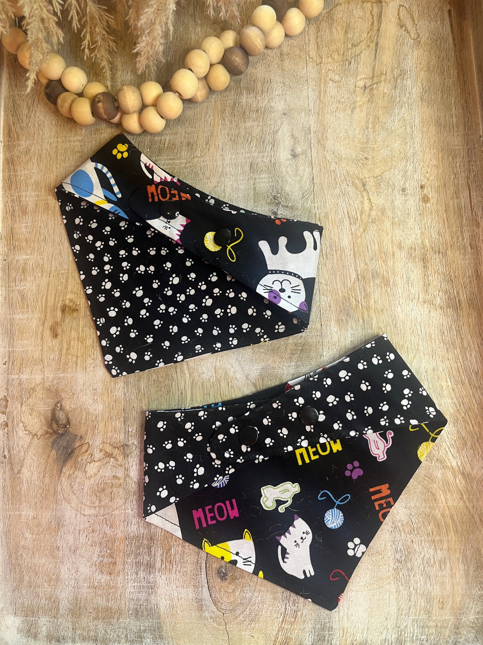 Who doesn't love a cute bandana for their fur baby! These bandana's are homemade and reversible with two snap closures in the back. The two snaps offer the ability to shorten or lengthen the bandana as needed.